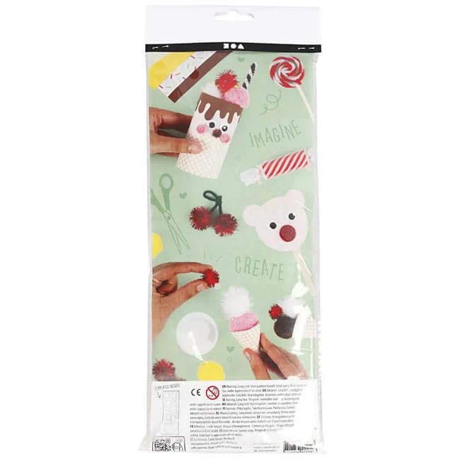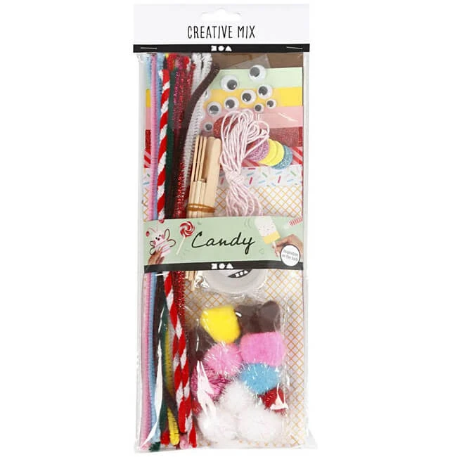 Inhoud: patroonpapier in 3 designs, gewoon papier in 4 kleuren, Sticky Base, glitterpapier, een assortiment van verschillende formaten, zelfklevende wiebelogen, houten stokjes in 2 maten en katoenen touw, plus pijpreinigers, pom-poms en zelfklevende cirkels van EVA-foam in een mix van heldere en glitterachtige kleuren.