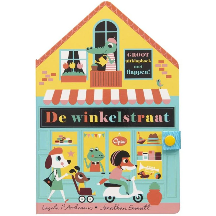 Een uitklapboek om te lezen en om mee te spelen. De winkelstraat is een prachtige nieuwe creatie van de razend populaire Zweedse ontwerpster Ingela P Arrhenius. De voorkant van het uitgeklapte boek toont een drukke winkelstraat waarin alle jonge lezertjes bij elke winkel flappen kunnen optillen om te zien wat er in de winkel gebeurt en wie erboven wonen. Klap je het boek helemaal uit, dan kun je verder spelen met het drukbezochte park op de achtergrond, dat is afgebeeld op de achterkant. Dit grote uitklapboek heeft een handige sluiting en is onweerstaanbaar voor zowel de jongste lezers als voor hun ouders. Met de flappen kan heerlijk gespeeld worden: de ideale combinatie van boek en speelgoed!