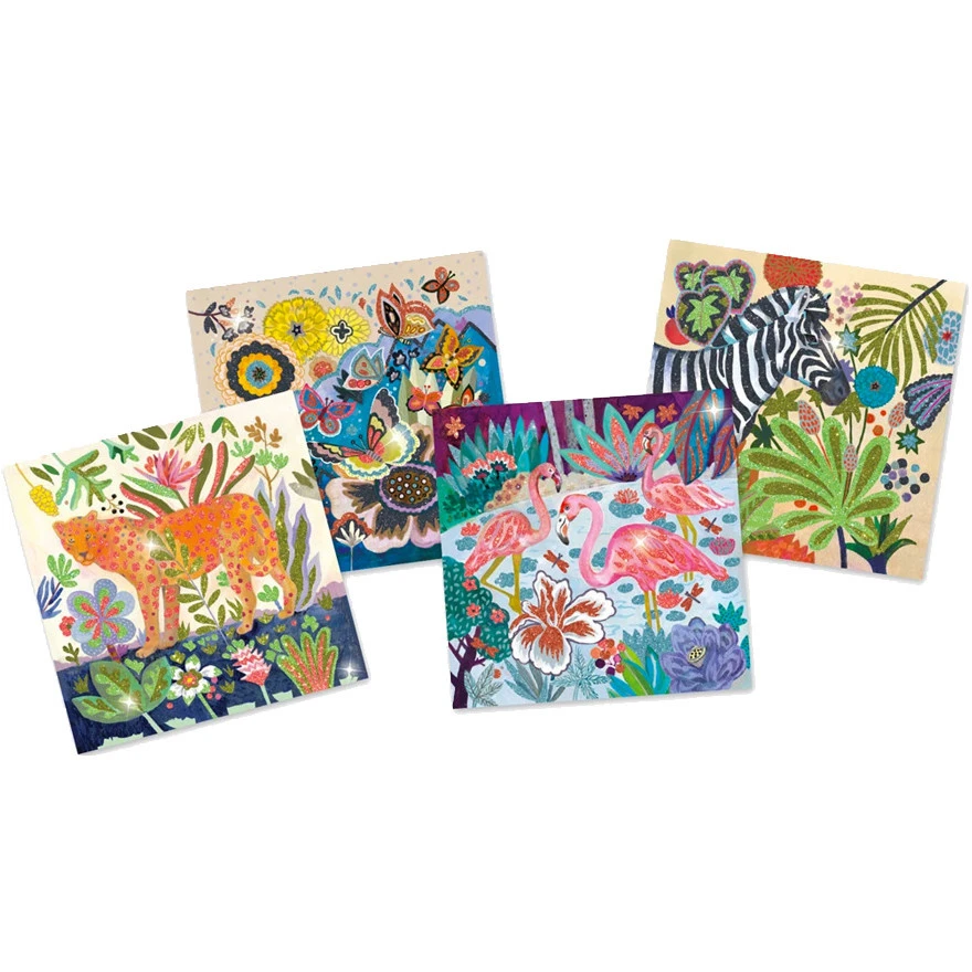 Maak prachtige tropische glitter schilderijen met dit knutselpakket van het merk Djeco. Met een speciaal pennetje kun je bepaalde stukken van het papier verwijderen, waardoor er een zelfklevend gedeelte vrij komt. Hierop kun je op het juiste nummer voorzichtig de glitters strooien. De glitters blijven dan vanzelf plakken; geen lijm nodig dus!