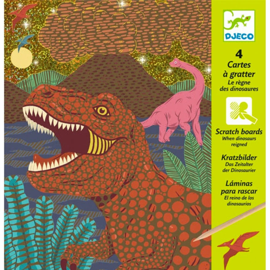 Dit knutselset van Djeco bevat 4 verschillende kaarten (20×15 cm) met illustraties van dinosaurussen, een houten pen om mee te krassen en een stap-voor-stap instructieboekje.
