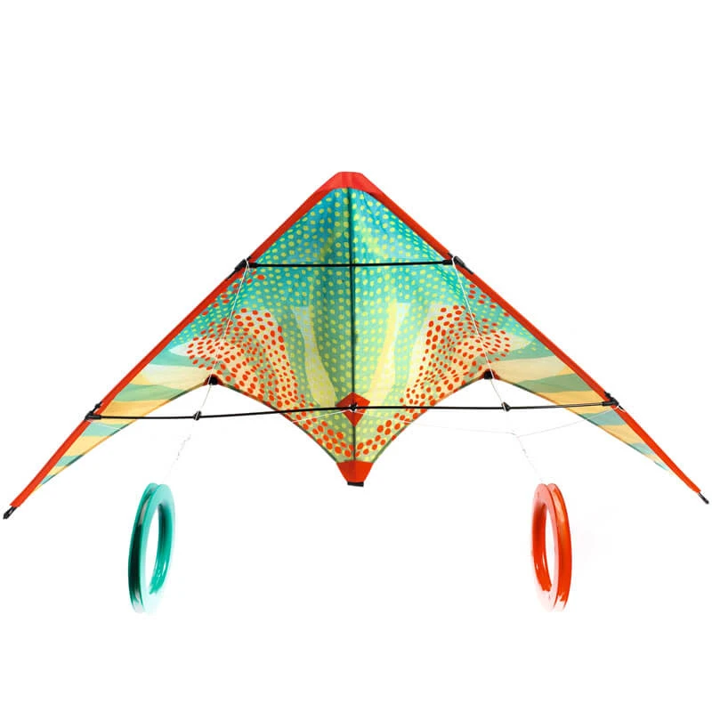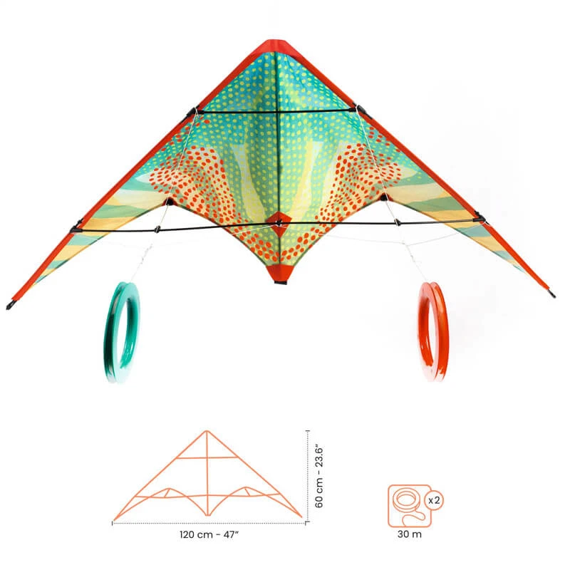 Djeco vlieger Red Dots is een bestuurbare stuntvlieger met 2 lijnen. Het is de perfecte vlieger om kennis te maken met besturing in de lucht en met het maken van acrobatische figuren, oftewel stunts!