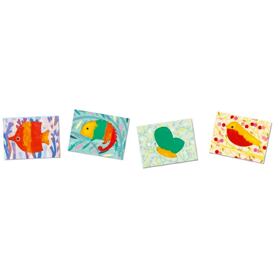 Zo werkt het: open het verf flesje, doe een paar klodders verf in verschillende kleuren op het vel en vouw vervolgens het transparante vel (met silhouet van een dier) naar beneden. Laat je kleintje de verf met de vingers uitwrijven en verdelen, en tada: het dier (kameleon, vis, vlinder of vogel) is klaar! Spoel de bladzijde af met water om hem meerdere malen te kunnen gebruiken.