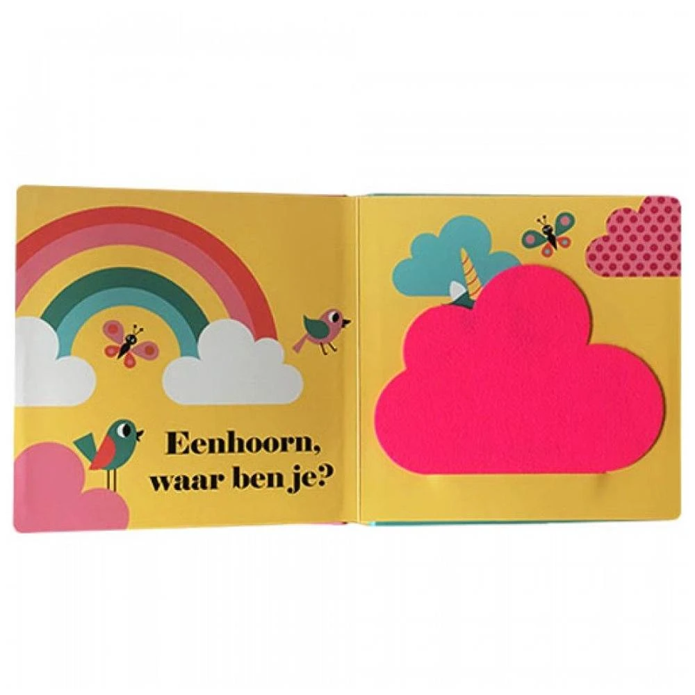 In “Eenhoorn, waar ben je?’ zitten allerlei sprookjesfiguren achter de flapjes verstopt. Kun jij de zeemeermin, de draak, de fee en de eenhoorn vinden? De flapjes zijn gemaakt van vilt: lekker zacht én stevig dus! Een zoek-en-vind-boekje voor de allerkleinsten, met als verrassing een spiegeltje op de laatste pagina.
