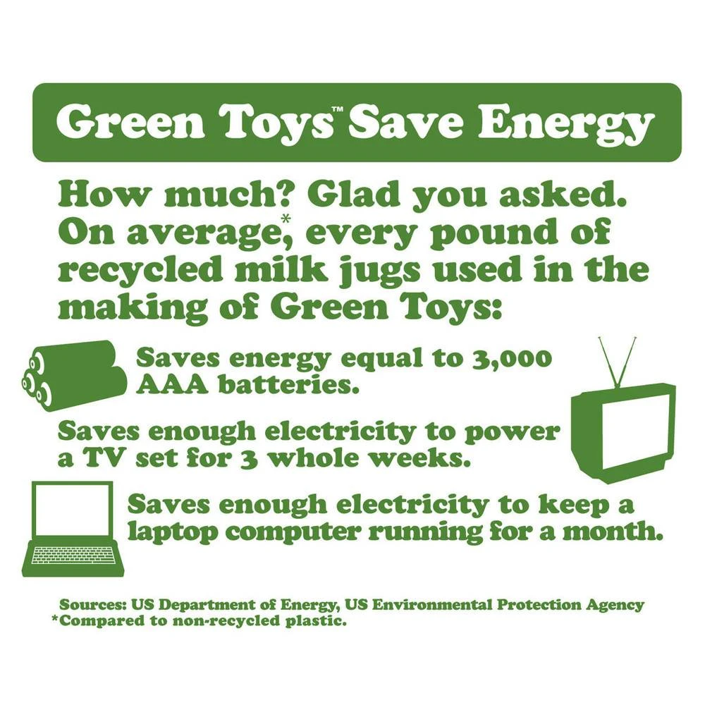 Het Amerikaanse merk Green Toys gelooft in een betere wereld. Het produceert eco speelgoed van duurzame kwaliteit, waarbij uitsluitend gebruik wordt gemaakt van gerecyclede plastic melkflessen en ander milieuvriendelijk materiaal. Dit helpt energie te besparen en de uitstoot van broeikasgassen te verminderen.