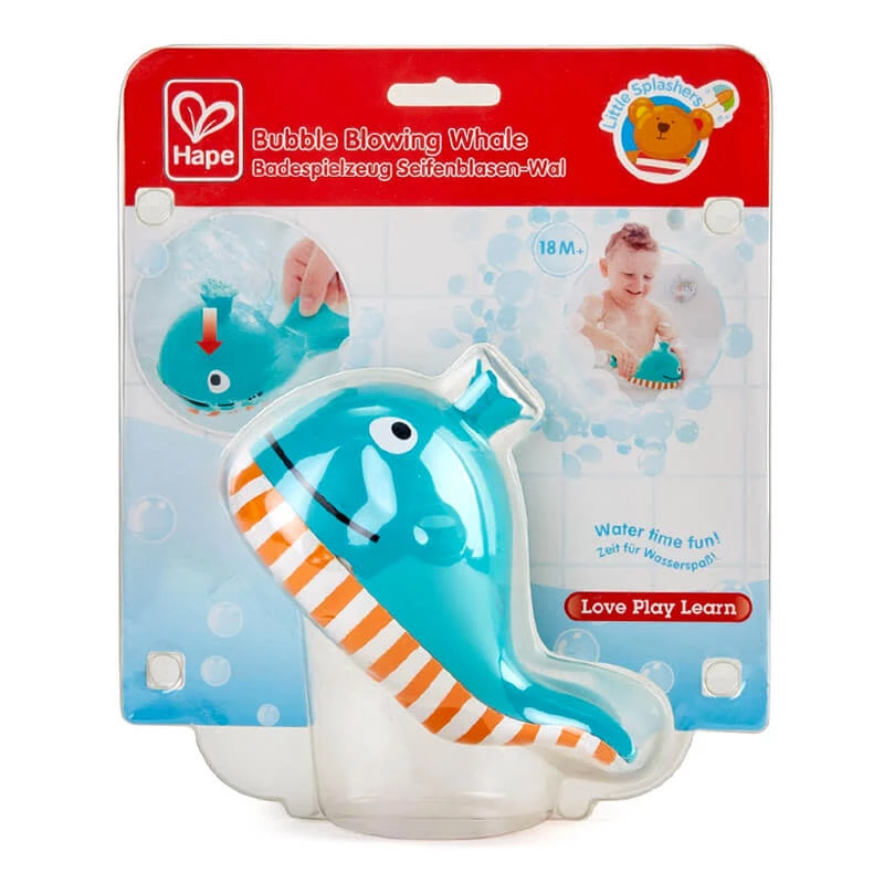 Maak zeepbellen in het water met dit vrolijke badspeelgoed van Hape. Doe een beetje vloeibare zeep of badschuim in het spuitgat. Als je de walvis vervolgens onder water duwt, komen er vanzelf allemaal bubbels tevoorschijn! De bellenmaker walvis is makkelijk aan zijn staart vast te houden en blijft drijven in bad. Gemaakt van BPA-vrij kunststof en erg duurzaam.