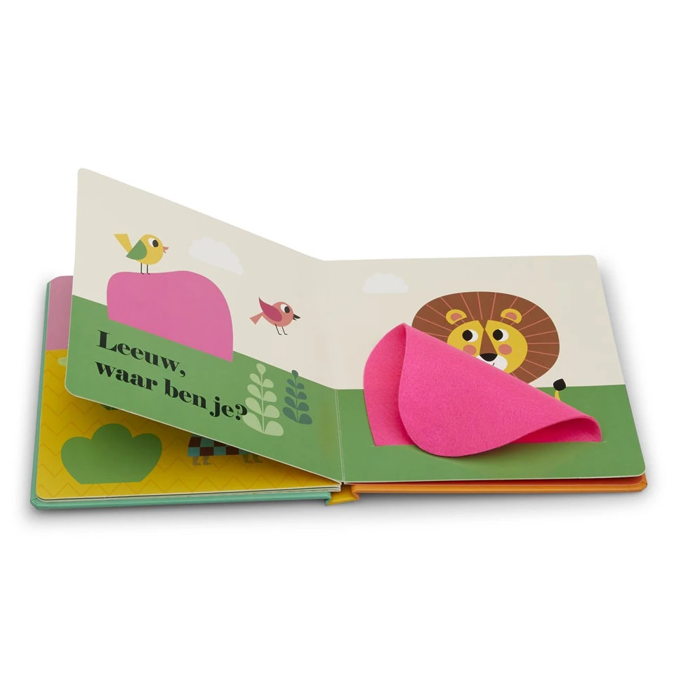 In ‘Hondje, waar ben je?’ zitten alle huisdieren verstopt achter de flapjes. Kun jij de poes, de muis, het konijn en het hondje vinden? De flapjes zijn gemaakt van vilt: lekker zacht én stevig dus! Een zoek-en-vind-boekje voor de allerkleinsten, met als verrassing een spiegeltje op de laatste pagina.