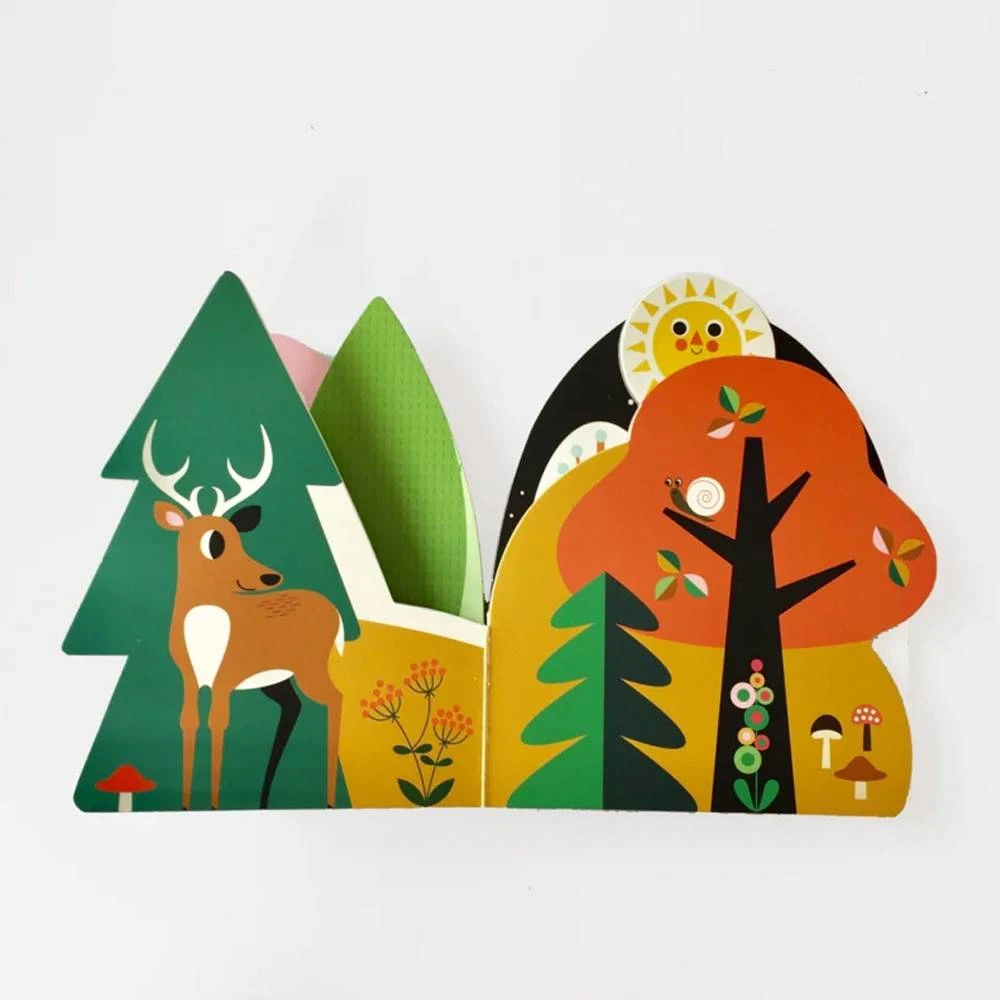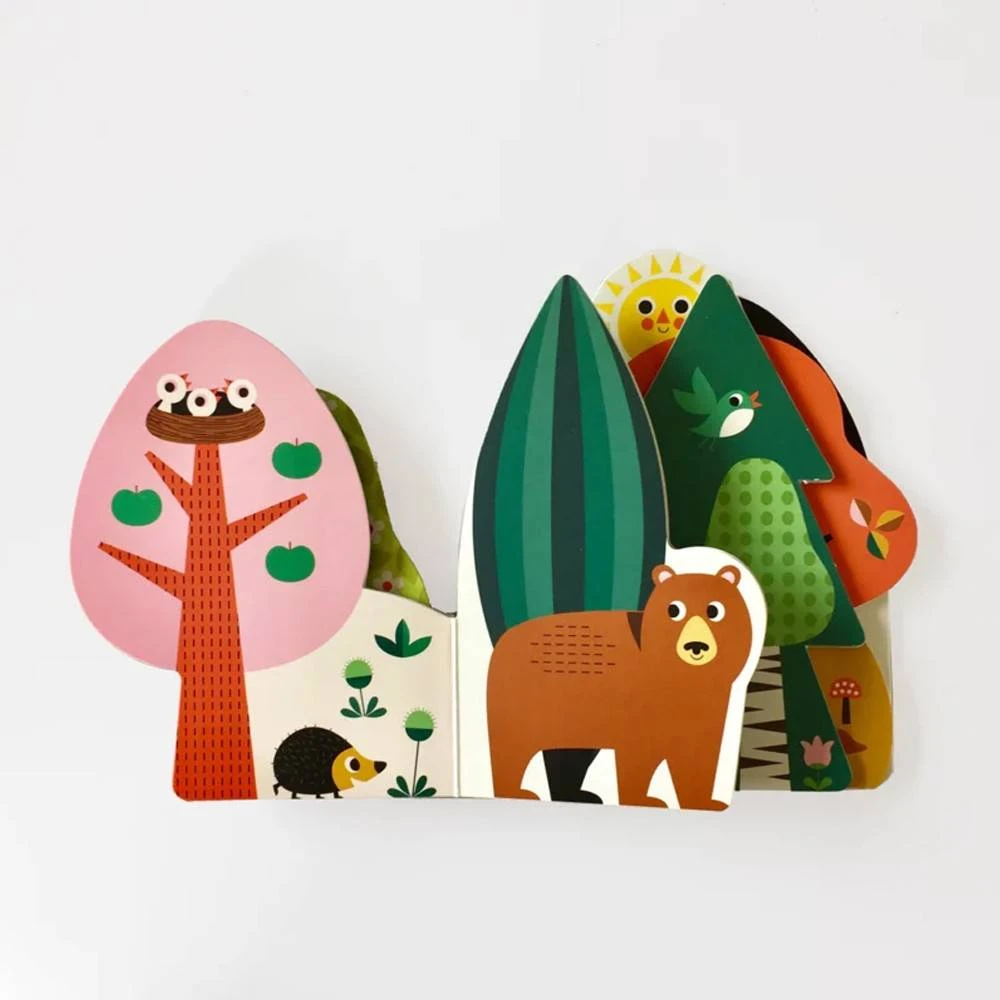 In dit prachtige boekje ‘In het bos’ heeft elke dikke kartonnen pagina heeft een andere vorm. De pagina’s van dit leuke, creatieve boekje hebben de vorm van verschillende soorten bomen. De pagina’s worden steeds een slag groter, waardoor je vanaf de voorkant het hele bos kunt zien. En het boekje kan gezellig als thema of sfeermaker op tafel of een plank worden gezet!