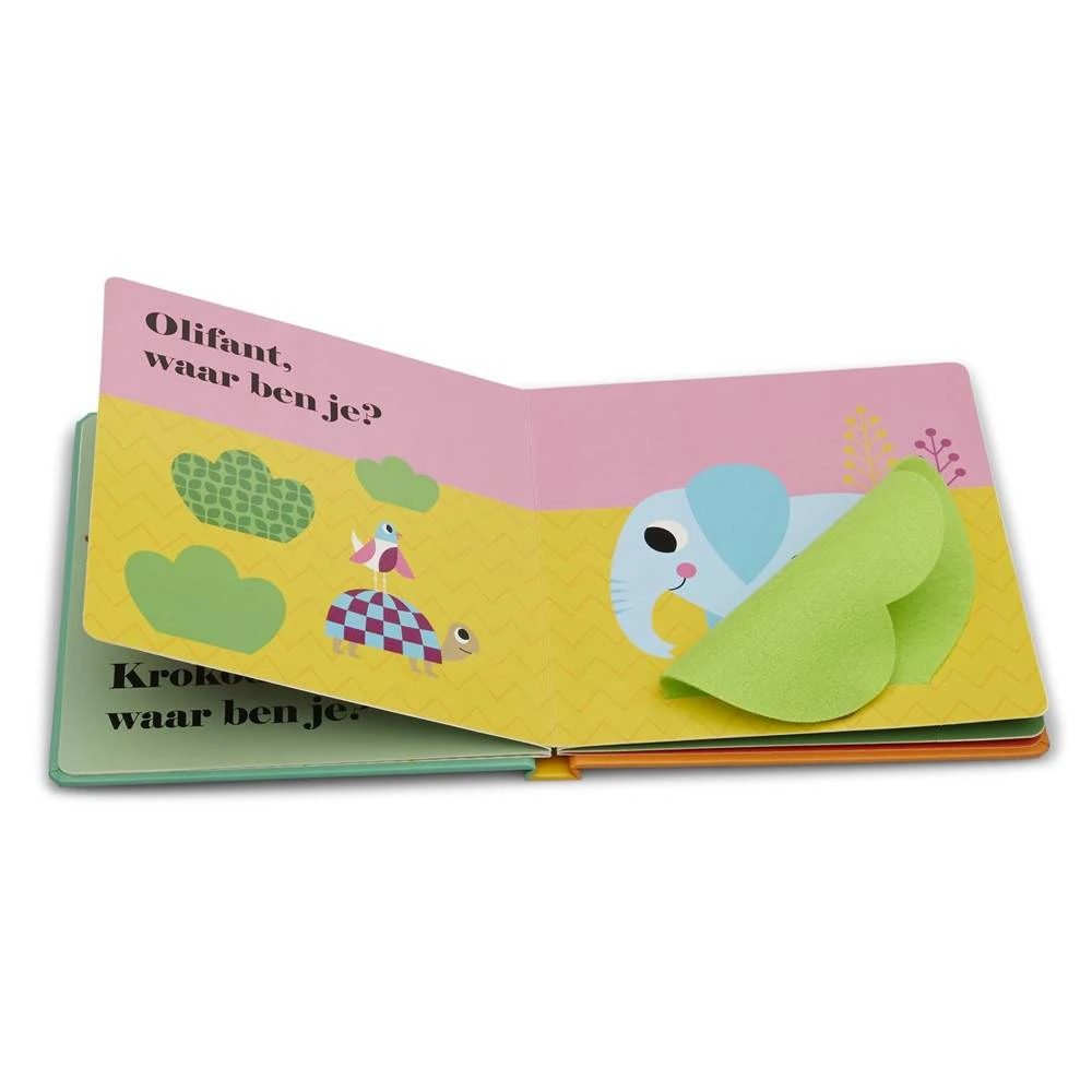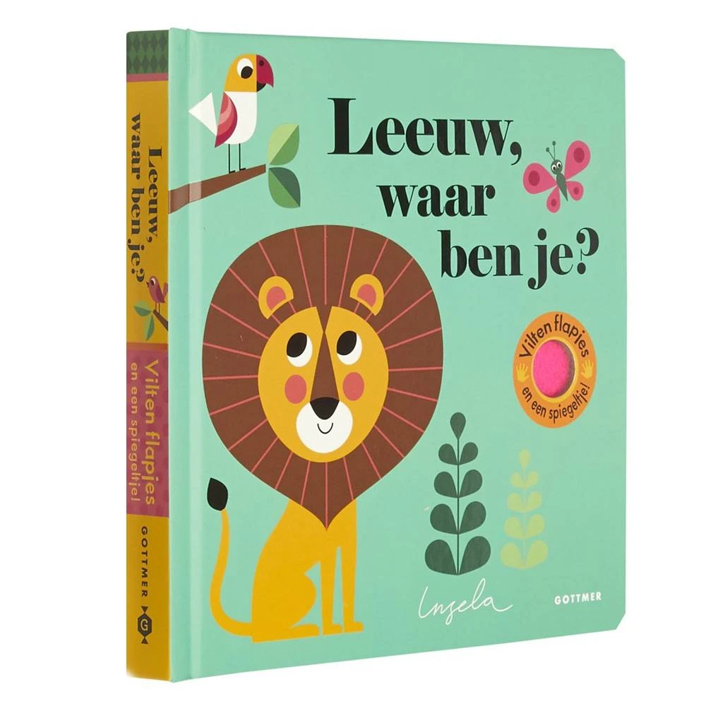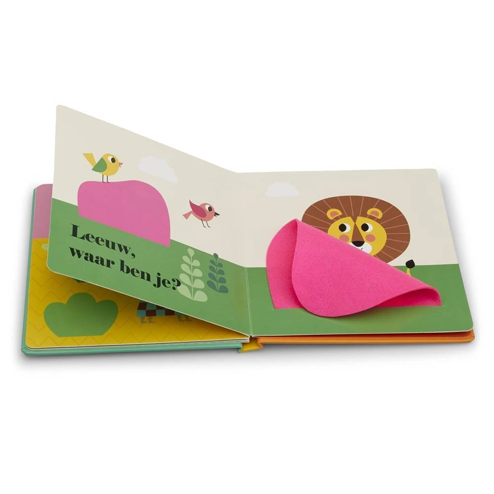 Peuters zijn dol op boeken met flapjes. Onder de flapjes van dit boek zitten allerlei dieren verborgen, zoals een olifant, een krokodil en natuurlijk een leeuw. Extra leuk is dat de flapjes van vilt zijn gemaakt: lekker zacht én stevig dus! Een zoek-en-vind-boekje voor de allerkleinsten, met als verrassing een spiegeltje op de laatste pagina.