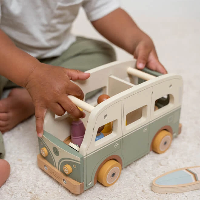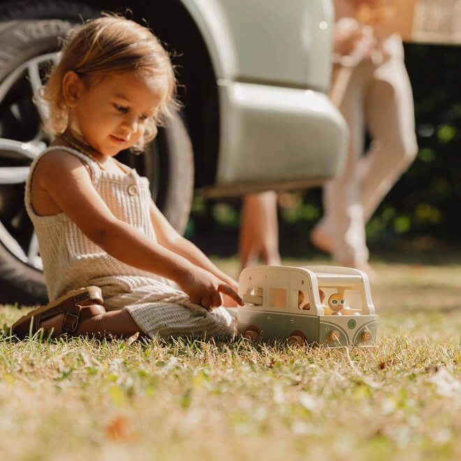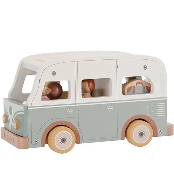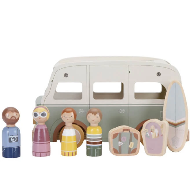 Het dak kun je er af halen zodat de 4 houten poppetjes er makkelijk in passen. De achterklep kan open om de bagage achterin de camper op te bergen.