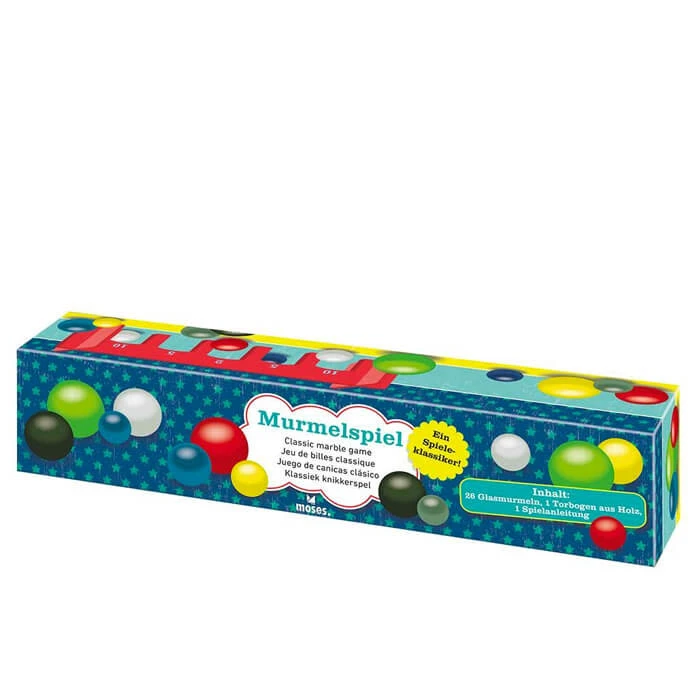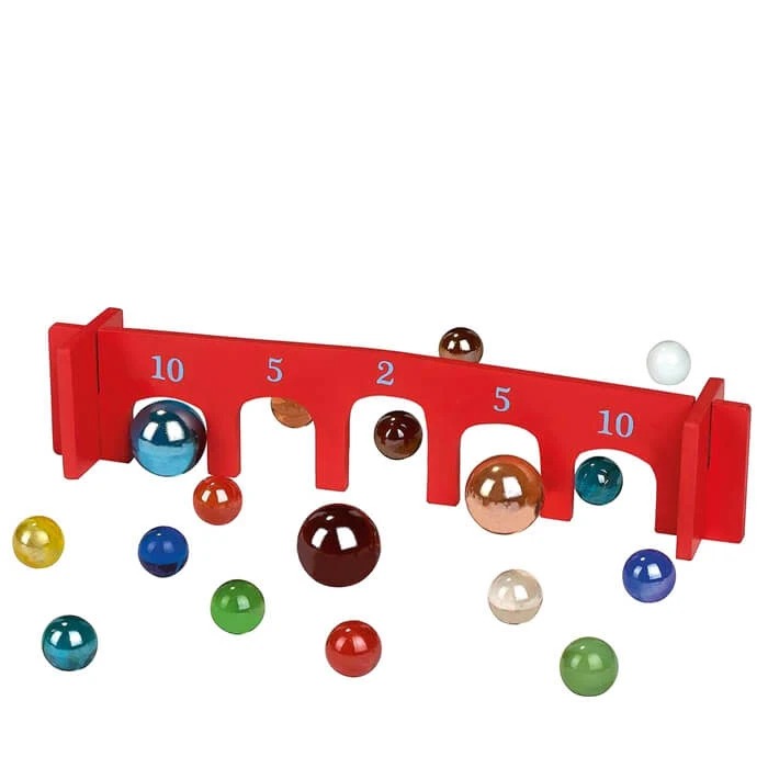 Leuk spelletje in compact doosje. 26 knikkers en een houten plankje met poortjes. Knikkeren maar! Hoe kleiner het poortje, hoe hoger het aantal punten. Verpakt in een mooi doosje met daarin 6 grote en 20 kleine glazen knikkers, 1 houten boog met poortjes en een spelhandleiding.
