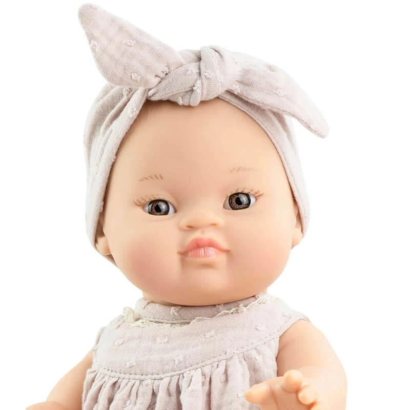 Paola Reina pop Johana is inclusief poppenkleertjes. Ze draagt een linnenachtig jurkje met borduursels en een strik met dezelfde stof. Deze pop wordt geleverd in een vensterdoos.