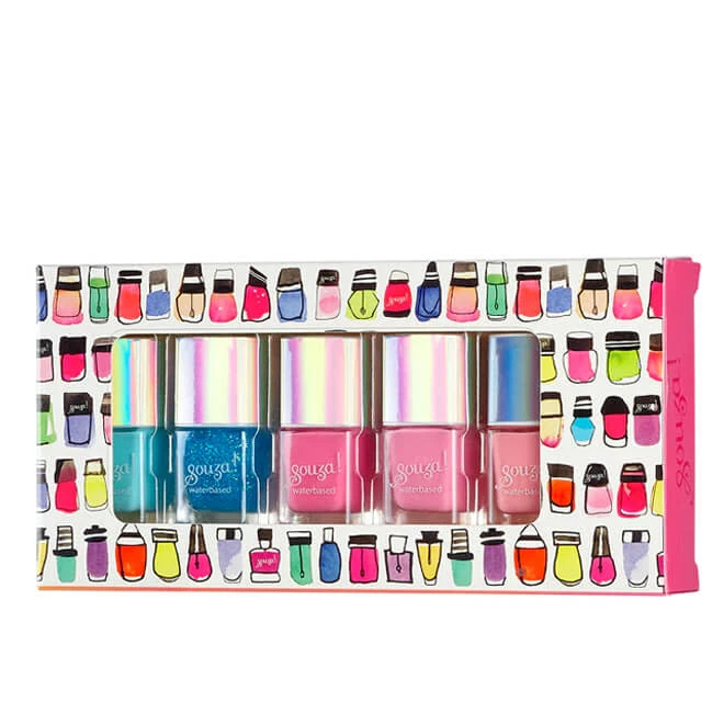 Souza nagellak set met vijf verschillende kleuren. Deze kindernagellak is op waterbasis en dus veilig voor kinderhandjes. De inhoud van elk flesje is 6 ml. De ingredienten zijn vegan.